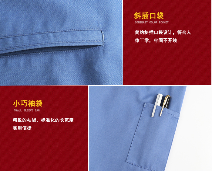 工作服的上衣左口袋主要是考慮插筆或做一些工號口袋使用,右口袋有考慮放手機或一些實用小物品,衣袖上的筆袋是考慮在工作時做一些記入時要用的筆可以放,所以袖袋也可以根據工作要求,做一些適合工作需要的筆袋,下面兩口袋主要考慮實用性的,另外還可以根據工作需要多做或少做一些口袋,這主要根據各企業的工作環境和要求制作。工作服的胸口口袋最好采用直插口袋,然后做口袋蓋,這樣可以有效防止工作中口袋里有物品掉出,影響工作和產品質量,所以一些不實用的口袋,對工作服來說最好不做,以免員工在使用中影響工作。