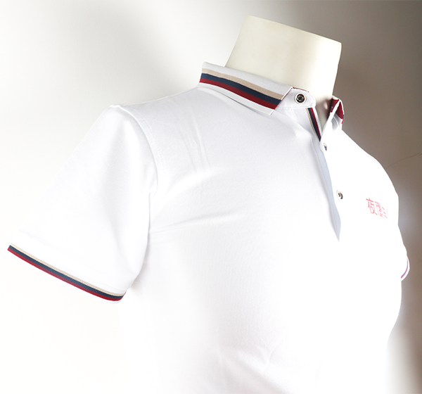 這款工作服主色調采用白色,在透氣、吸汗上有一定優勢,因夜鷹車燈工作人員普遍為男性,所以選擇了T恤的款式,領口和袖口使用藍紅灰色條紋,簡約而不失時尚感,扣子使用子母扣,美觀不易脫落,