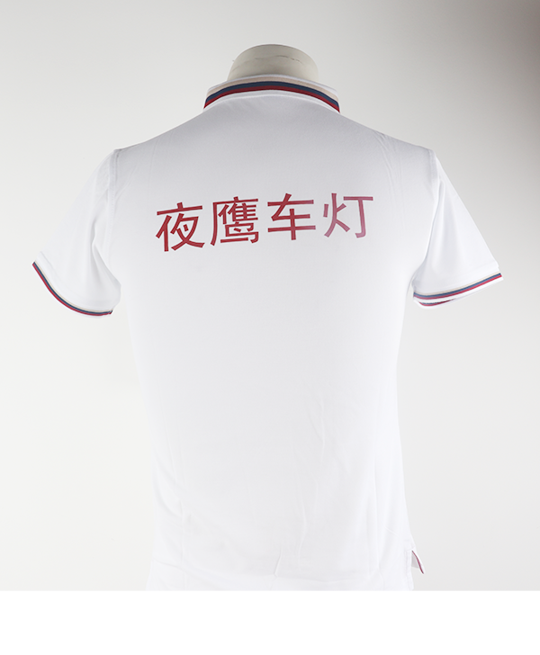 同時在胸前和后背印制紅色logo:夜鷹車燈,提高了企業的識別度,logo大小位置顏色經過了幾次修改調整,不會顯的突兀同時又能完美體現企業標識。