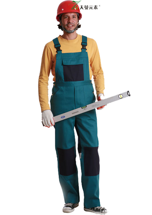 Fabrics: 100% Cotton, Fire Retardant, 10*10, 80*46, 320 gsm; waist adjustable;one breast pocket with flap, two side slash pockets,zippered fly, back patch pocket,elasticated bib bands with buckle adjustable.